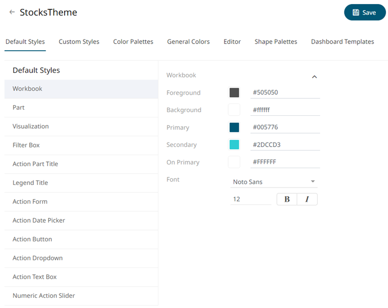 When you define the default settings of a theme, you specify the colors and fonts of the workbook, parts, visualizations, filter box, action part title, legend title, and action form.