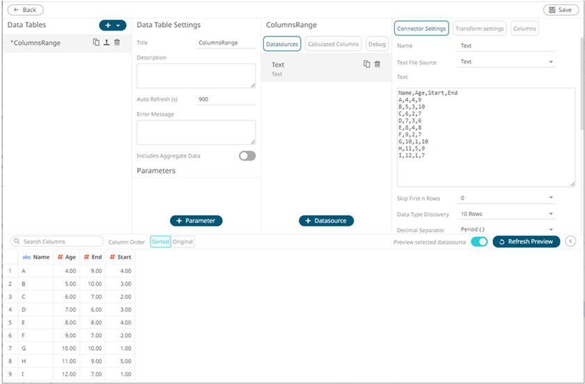 On the visualization, when the Age column is dragged to the X variable, the Min and Max values are applied.