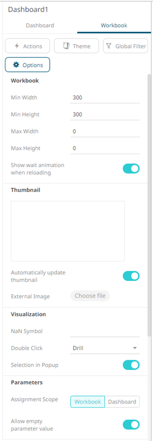 1. On the Dashboard and Workbook Settings pane, click the Workbook tab.
