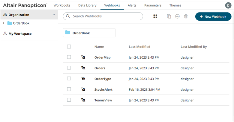 Sorting webhooks can be done by Name, Last Modified, or Last Modified By.