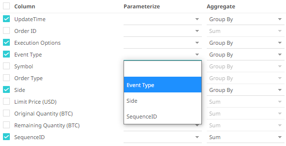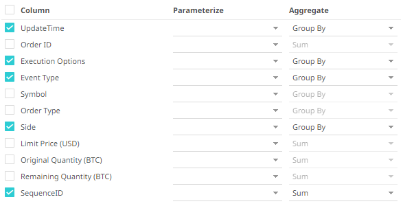 3. If the data returned is to be aggregated, then check their Column box. For each selected column, the possible aggregation methods are listed including: