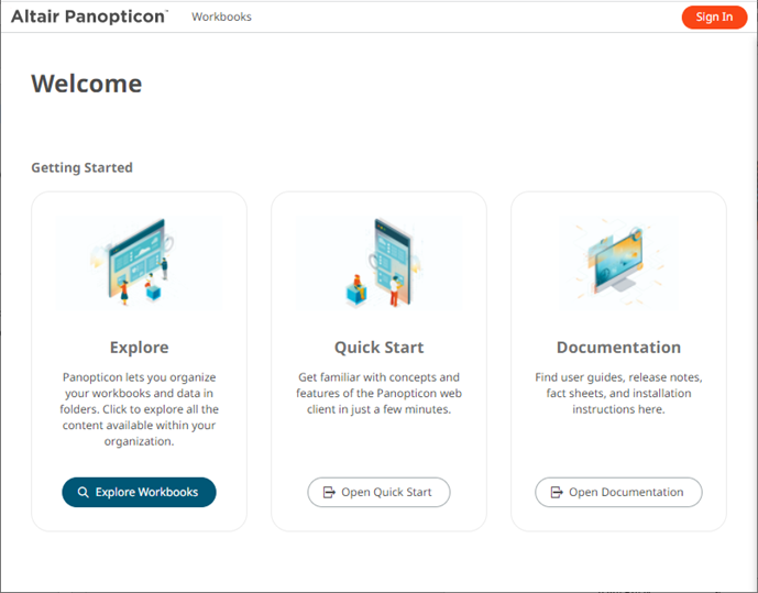 The Welcome page is the first screen that displays when you log on to Panopticon Real Time. This page can also be accessed by clicking the Altair Panopticon logo on the header.