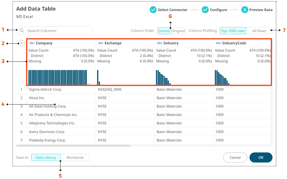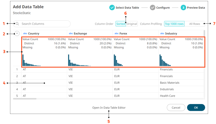 Column Profiling Perform column profiling either for the Top 1000 Rows or All Rows. |