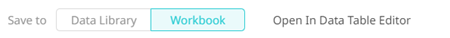 Save to Data Library or Workbook · Allows you to save the data table in the data library or in the workbook. · Selecting Workbook displays Open in Data Table Editor. Clicking Open in Data Table Editor displays the Workbook Internal Data Table Editor layout where you can further configure the data table. |