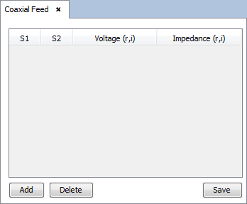 To add a feed point, select one or two surfaces of the object and click on 'Add' button. A feed point between the surfaces (or an auto feed if only one surface is selected) will be added from the table with a voltage of (1.0, 0.0) and impedance of (0.0, 0.0) that can be modified clicking on the corresponding cell. After setting the values, press Save to add the feed point.
