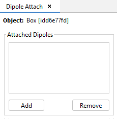 In order to attach the dipoles to any object, the user must create them first. After doing so, selecting the desired object in the Geometry Panel or Tree and clicking in Source → Dipole → Attach Dipole to Object will take us to the proper panel. Here the user can select the desired dipole and clicking the Add button will attach that dipole to the specified object. The Remove button let the user detach an attached dipole without deleting the dipole.