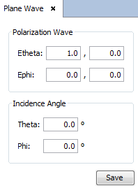 One possible kind of excitation source is the plane wave. If enabled, a plane wave with the parameters described by the user will be simulated. When a plane wave is being defined, a panel similar to the one displayed in the following figure is presented. The user can modify the values for the polarization wave and the incidence angle, represented using spherical coordinates.