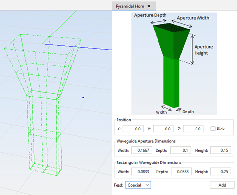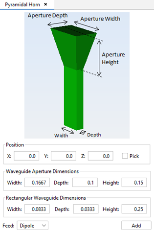 • Rectangular Waveguide Dimensions: set the values for the rectangular geometry on the bottom of the antenna. 'Width' and 'Depth' values will be added to the bottom sides of the pyramidal geometry on the top of the geometry.