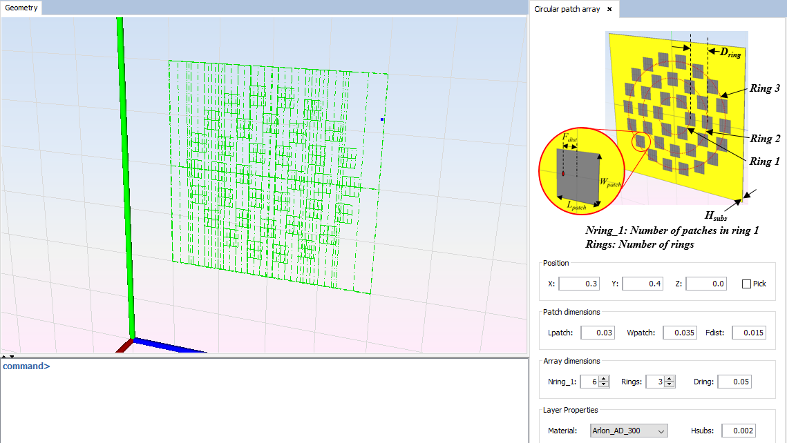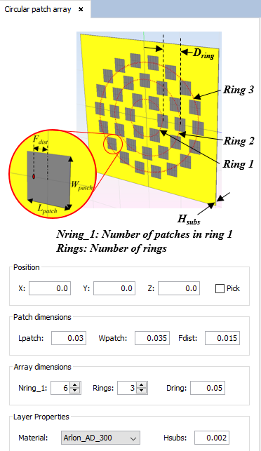 • Array dimensions set the values of the number of patches in the first ring (Nring_1), the number of rings (Rings) and the distance between rings (Dring).