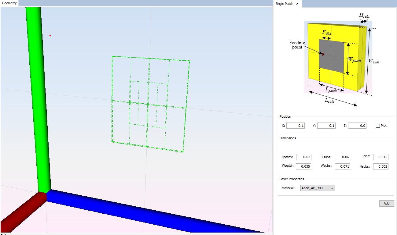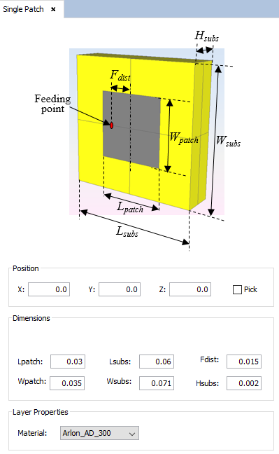 Dimensions set the values of the length and width of the patch (Lpatch and Wpatch), the position of the feeding point from the center of the patch (Fdist) as well as the length, width and height of the substrate material (Lsubs, Wsubs and Hsubs).