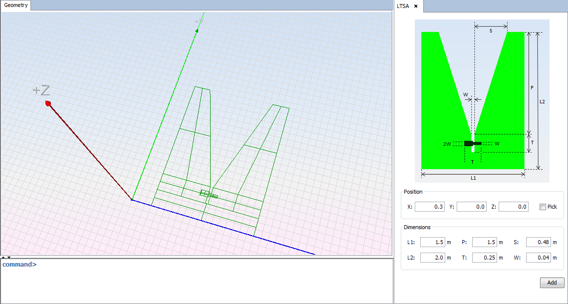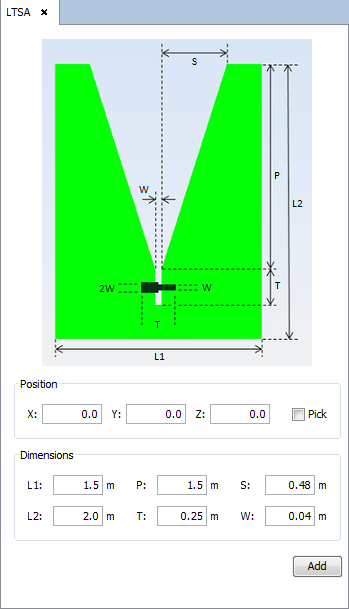 - Position: set the Cartesian coordinates for the position of the antenna. For the antenna, the user can select the position with the mouse by selecting the 'Pick' check box and clicking any point in the geometry panel.