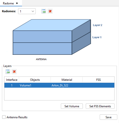 interfaces and the material defined on the inner interface. Click on to add a new radome.