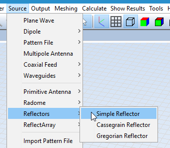 This option allows the user to create a paraboloid reflector. This is a reflector that has a paraboloid shape. It can be created by selecting Source > Reflectors > Simple Reflector on the menu bar or by issuing the command "simpleReflector".