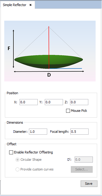 - Enable reflector offsetting by checking this option, the paraboloid will be offset. The user can provide the shape for the offset paraboloid. The circular shape is already provided as an option. The behavior of offset paraboloids is further detailed below.