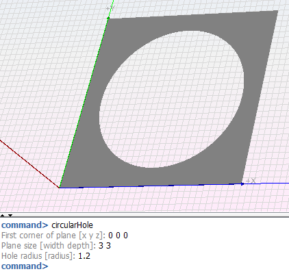 - circularHole -n name -p cornerX cornerY cornerZ width depth radius: Create a new circular hole.