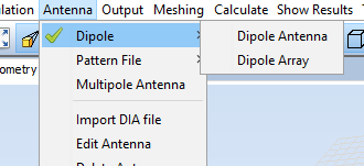 The "Dipole" menu item contains two options to add dipole antennas to the current simulation. The user may add an individual dipole antenna or a array of dipole antennas. The "Dipole Array" option allows the user to add multiple dipole antennas that will be simulated together. This allows the results to be calculated for the group of antennas as a whole, and not for individual antennas (this is useful when calculating coupling results between groups of antennas).