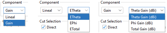 - Gain (dBi): Theta Gain, Phi Gain, Total Gain components