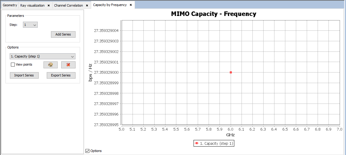 In this case, the user can visualize the capacity values in terms of the step for a given frequency value. It is possible to add more plots for different frequency values by selecting the frequency and parameter set and pressing the "Add Series" button. The rest of the functionality is the same as in the "MIMO Capacity by frequency" panel.