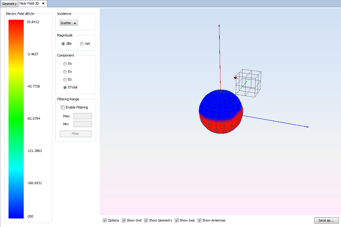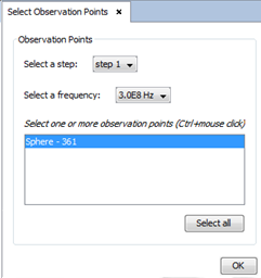 In this panel, the user can select a step, a frequency (from the set of sampled frequencies) and a set of observation points (holding the Ctrl key, the user can select more than one item from the list). When the user presses the OK button, the following window will be opened, showing a 3D diagram of the near field values on the selected observation points: