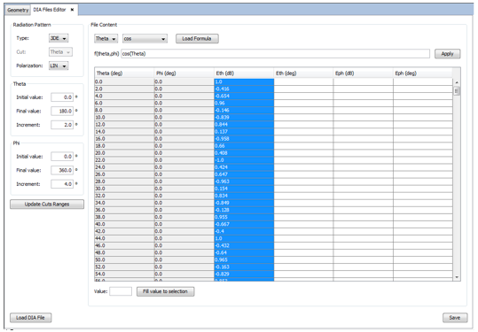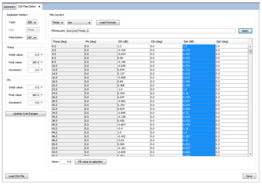 Step 3: Introduce the following parameters in the DIA Files Editor. The formula shown in the first figure has been used to fill the Etheta(dB) column, and the formula is shown in the second figure has been used to fill the Ephi(dB) column.