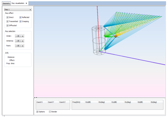Step 12: When the calculation has finished, press Show Results → View Ray. On the left side of the Ray Visualization panel, select Step 2. The result should be the same as in the following figure: