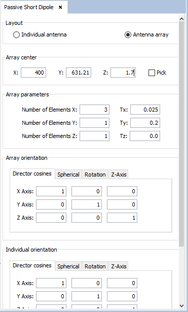 Click on Output – Coupling – Short Dipole and select the Antenna array option. Set the parameters as shown.
