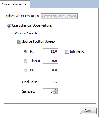• Spherical observation. If the position of the source has been defined in spherical coordinates, this option will be available. It is possible to define a parametric sweep for one variable (radius, theta or phi) selecting the check box Source Position Sweep. The initial value for R, theta and phi have to be specified.