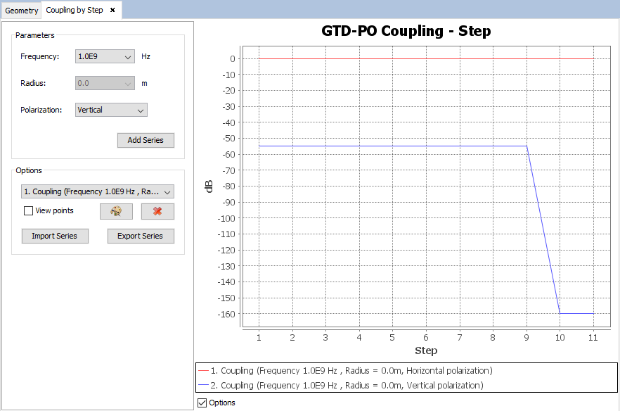 This option allows the user to visualize the coupling values at each step in a graph. The user needs to select the frequency, observation and polarization they want to plot the values for. When the user presses the "Add Series" button, a plot will be added.