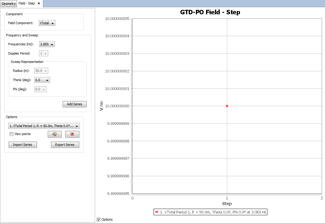 When initially open, the panel will display a default series in the plot that will represent the measurements for a particular component, frequency and observation point, against every possible step that has been simulated. More series can be added, by selecting component and frequency in the control panel that appears left side to the plot.
