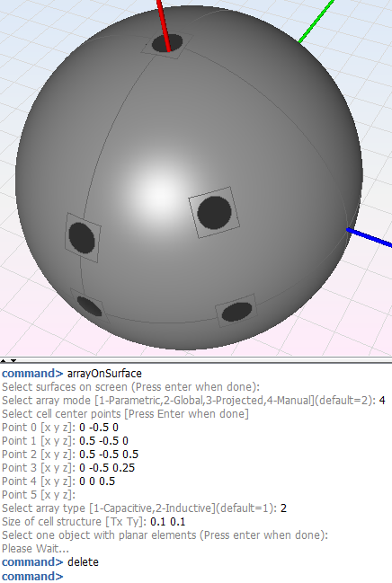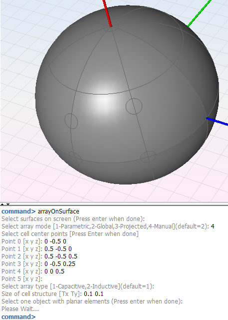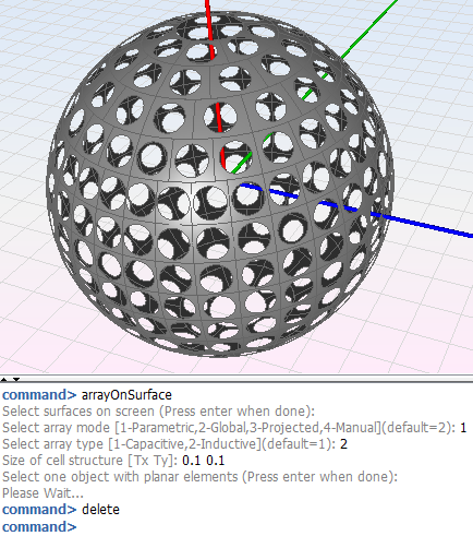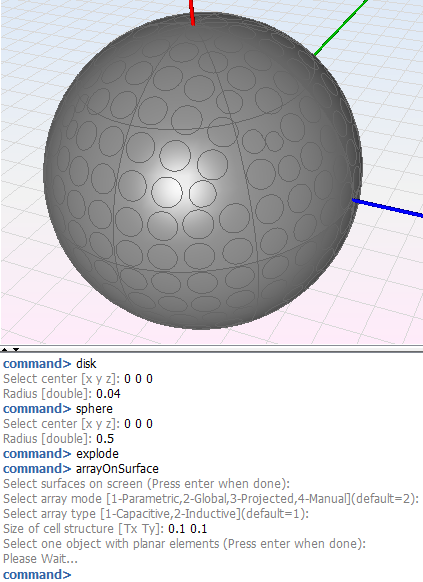 The next figure shows the full example of the disk array on the sphere with all the parameters required by default (the original objects have not been deleted).