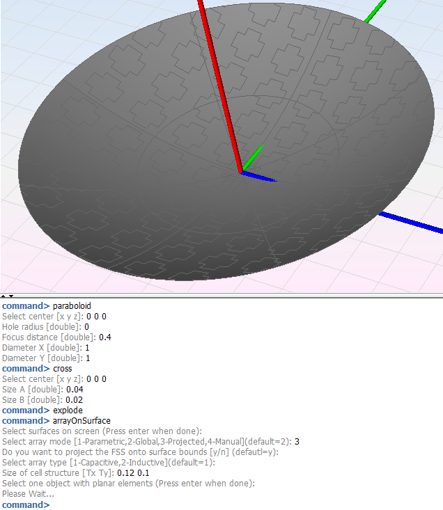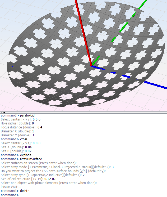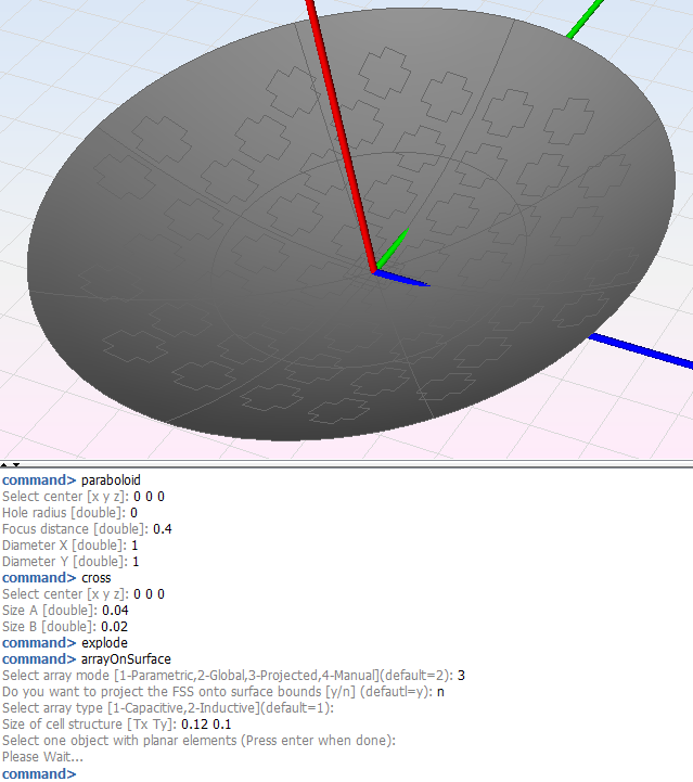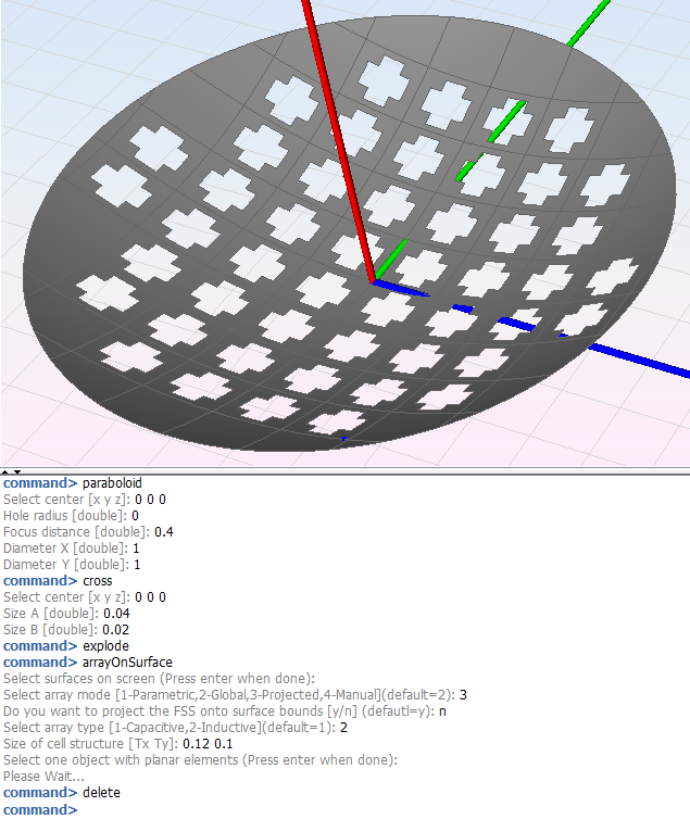 The next figure shows the full example of the cross array on the paraboloid with inductive mode and the rest of required parameters by default (the original objects have been deleted).