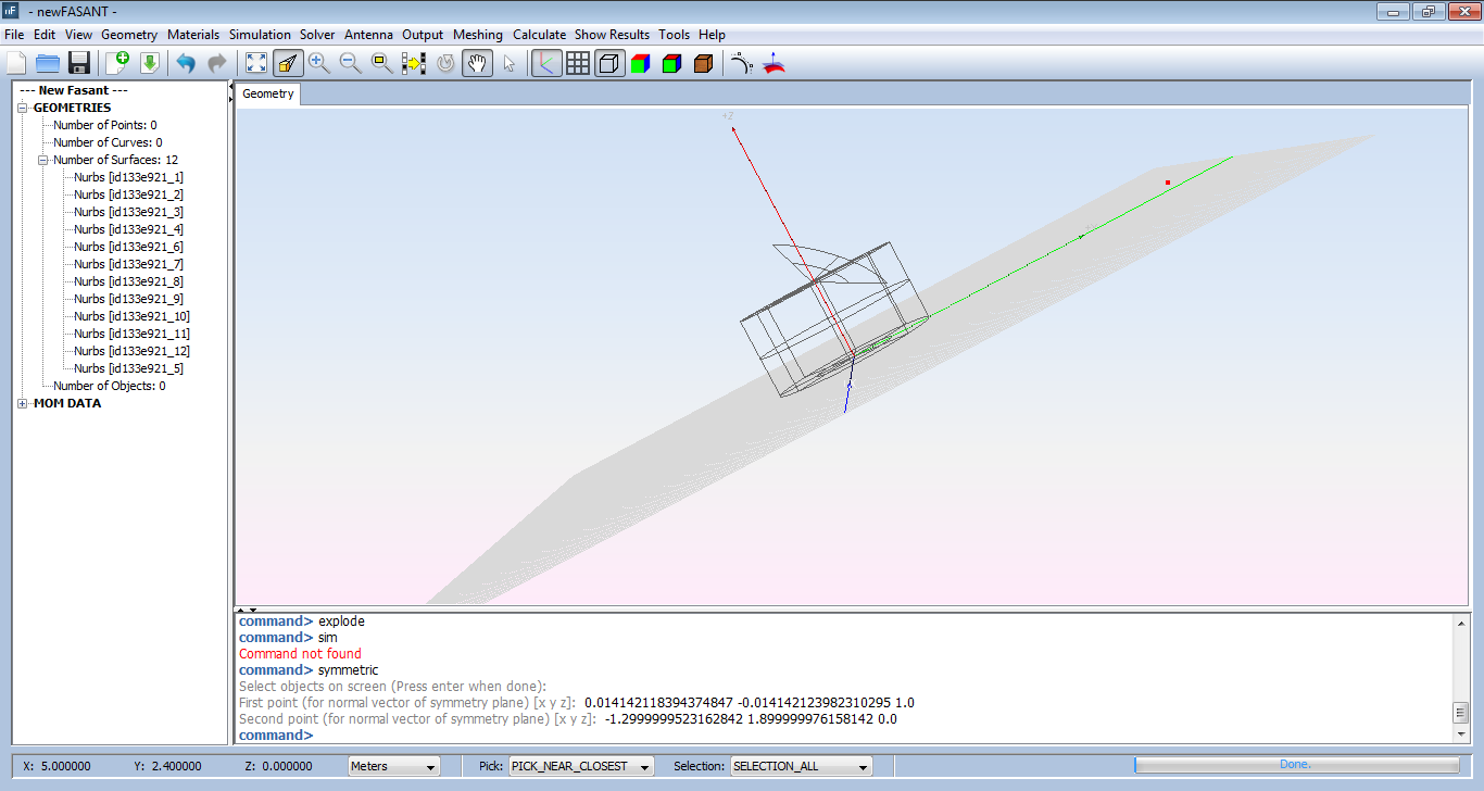 By selecting the proper surface or figure, the system will require to introduce two points. These two points form a vector which is the vector normal to the plane of symmetry. Pressing enter creates the symmetric of the selected surface from this plane.