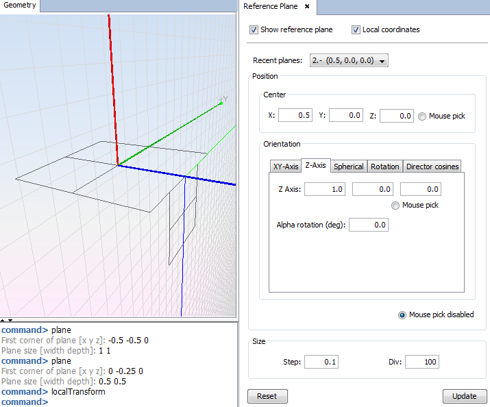This option applies the transformation of the Reference Plane to the selected objects, and also can be used by using the localTransform command. It is useful to create geometrical objects in the default origin and then translate and orientate them with the desired reference plane.