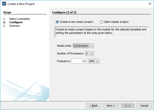 • Create a new empty project use this option to create a brand new project using the optimized default parameters for the particular template selected in the previous step. It is still possible to modify some of the parameters using the controls below, such as the default units, the number of processors (a number that is set by default to the number of processors in your system), or the project simulation frequency.
