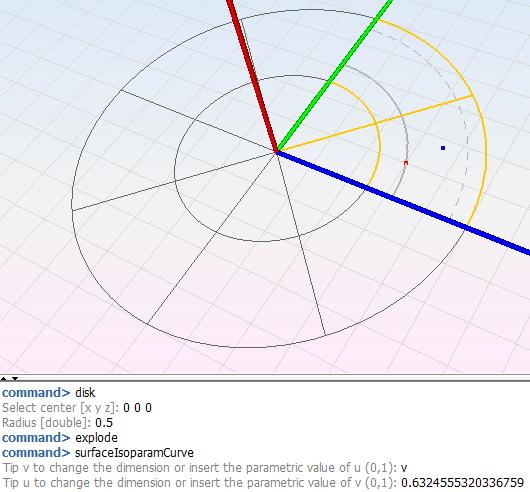 Any isoparametric curve of a surface (in the U- or V-dimension) may be obtained by using this command. To do this, only one surface will be selected. Then, tip “u” or “v” to change the parametric dimension where the curve will be extracted and insert the parametric value of the desired coordinate (pick mouse functions make easier this operation).