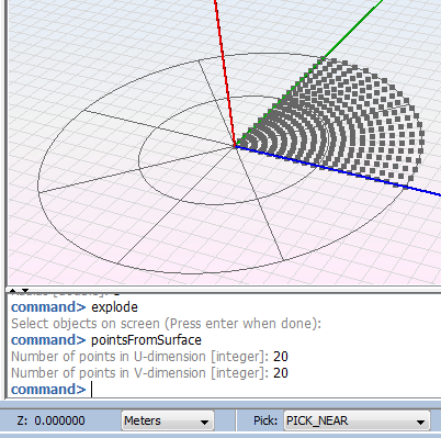With this submenu the user can generate several points along the two parametric dimensions of a selected surface. The user needs to introduce the maximum number of points along the U-dimension and the V-dimension of the surface. When the selected surface is a trimmed surface, only the points in the valid region (by default) or all the grid points on the surface (-noTrim option) can be obtained.