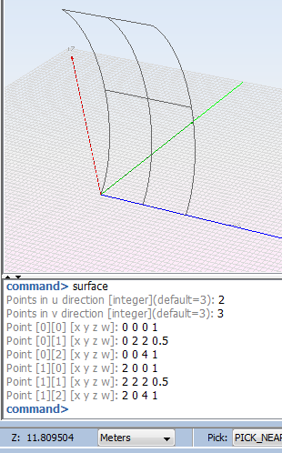 This option allows the user to create a NURBS surface. The parameters that this function receives are the number of points in u and v direction (this determines the degree of the NURBS surface) and the points themselves. The number of points the program will ask for will be the product of the number of points in each direction.