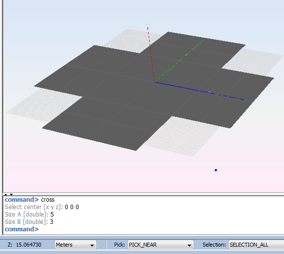 This function allows the user to create a cross-like surface. The parameters that this function receives are the center point and two distances (Size A and Size B). Size A defines the side of the central square forming the cross, while Size B defines one of the sides of each of the four rectangles around the square.