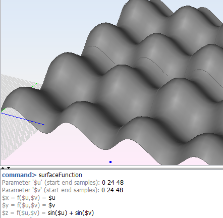 This option creates a surface by defining two parameters and three functions. To create the curve is necessary to define the '$u', '$v' parameters. With these parameters, the user will define three functions f($u, $v), for the x, y, z coordinates. The resulting surface will pass through all of the points.