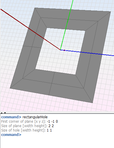 The rectangularHole primitive allows the user to quickly create a rectangular surface with a hole defined on its center. Usage: