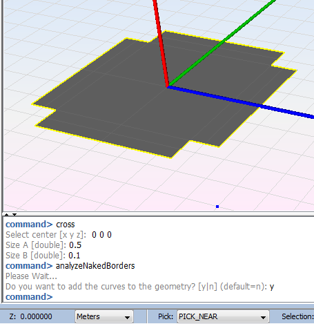 This tool shows the borders of the surfaces in the geometry that are not connected with another ones. The command only shows the naked borders, but it asks to the answer whether the detected borders must be added as new curves in the geometry or not, as shown in next figure.
