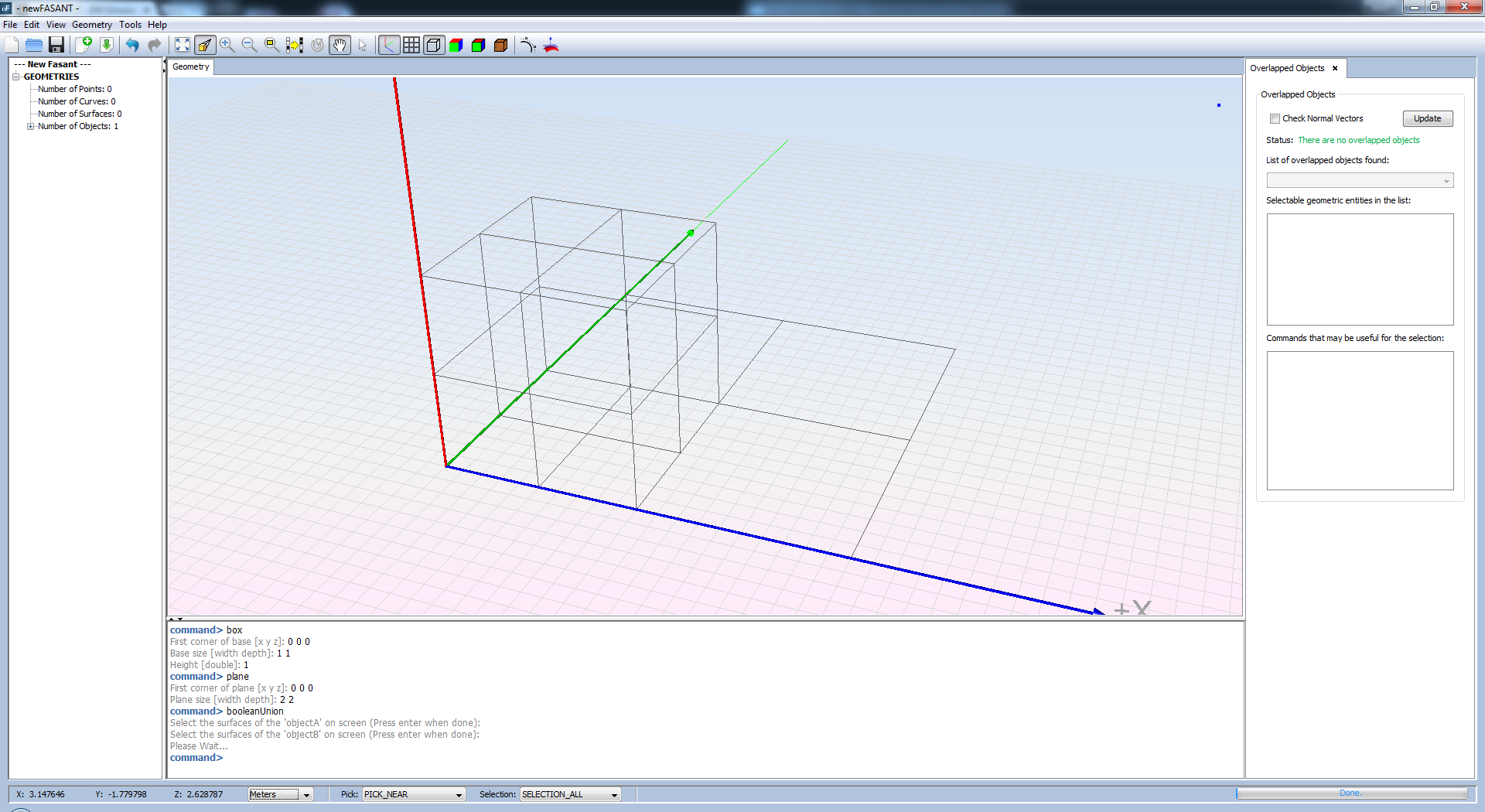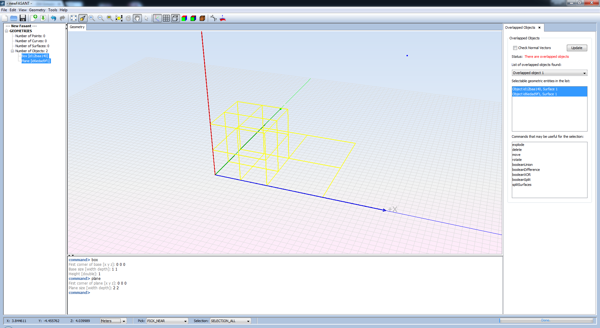 Without changing the existing geometry again, unselect the option Check Normal Vector and then click on the Update button to re-run the identification and come back to the first configuration. Then we are going to solve the overlap issue by using one of the suggested commands. Click twice on booleanUnion, and then select the box as "objectA", and the plane as "objectB".