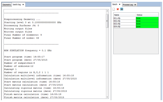 To stop the Batch simulations, go to Process Log tab and press Abort button. To finish the Batch simulation, the user can be visualize the log.