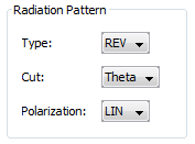 Radiation pattern: In this section we can see three options the type of radiation (mentioned above), angular range to be considered, only visible in REV type, and Polarization, to indicate a linear or circular polarization.