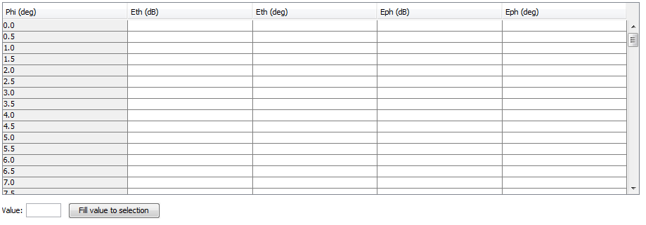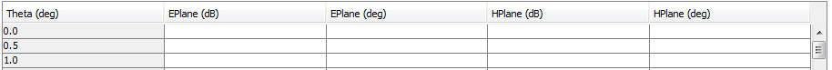 The attribute Theta describes the angle in degrees, Etheta (dB) and EPhi (dB) describe the module and Etheta(deg) and EPhi(deg) the phase values.