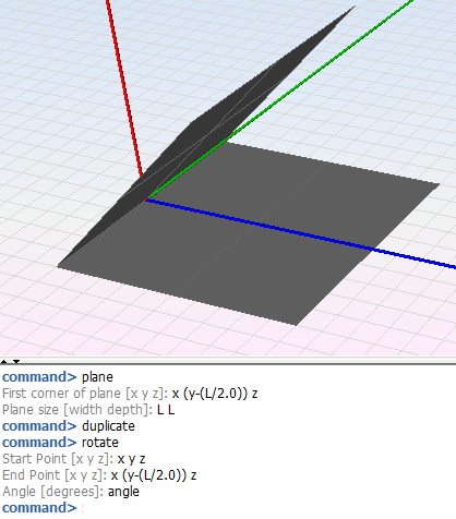 - Second step: Geometry creation. The dihedral consists on two square planes that share a common edge, and the angle between them is given by the parameter angle that has been previously defined. The next figure show the commands performed to create the geometry.