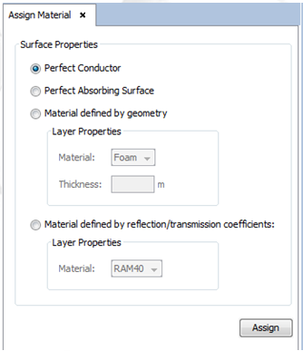 The geometric properties assigned to materials can be edited by clicking on Materials - Assign. After selecting this option, the surfaces/objects assigned to specific materials must be selected, and confirm the selection with the “Assign” button as shown in next Figure.