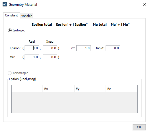 Figure 2. Material defined by geometry, tab ‘Constant’