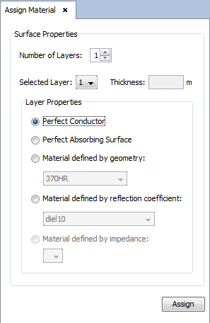 For each layer, the user can select one of the following material types but can’t assign material properties defined by geometry, material properties defined by reflection coefficient, and material properties defined by electrical impedance to the same surface.