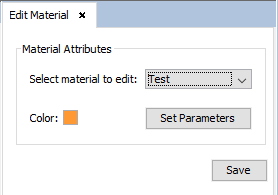 The user can select the material to edit in the drop-down list next to the "Select material to edit:" label. It is possible to edit the color of the selected material by double-clicking the box next to the "Color" label. The "Set Parameters" button allows the user to modify the reflection/transmission coefficients of the materials. For more details on the edition of the parameters of a material, refer to the "Add" section.